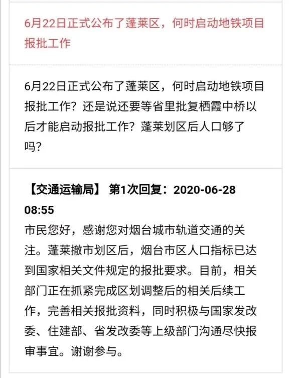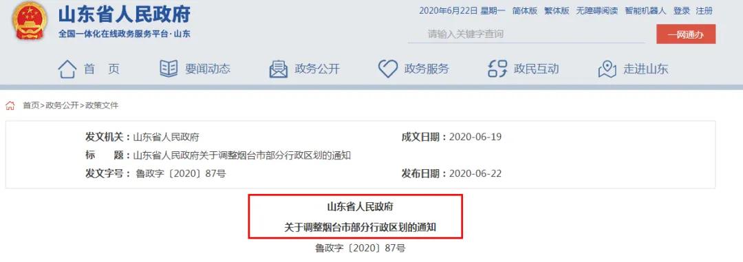 这种背景下,烟台通过行政区划调整,满足了市区人口的要求。2020年,山东省官方网站发布了《关于调整烟台市部分行政区划的通知》,其中提到: